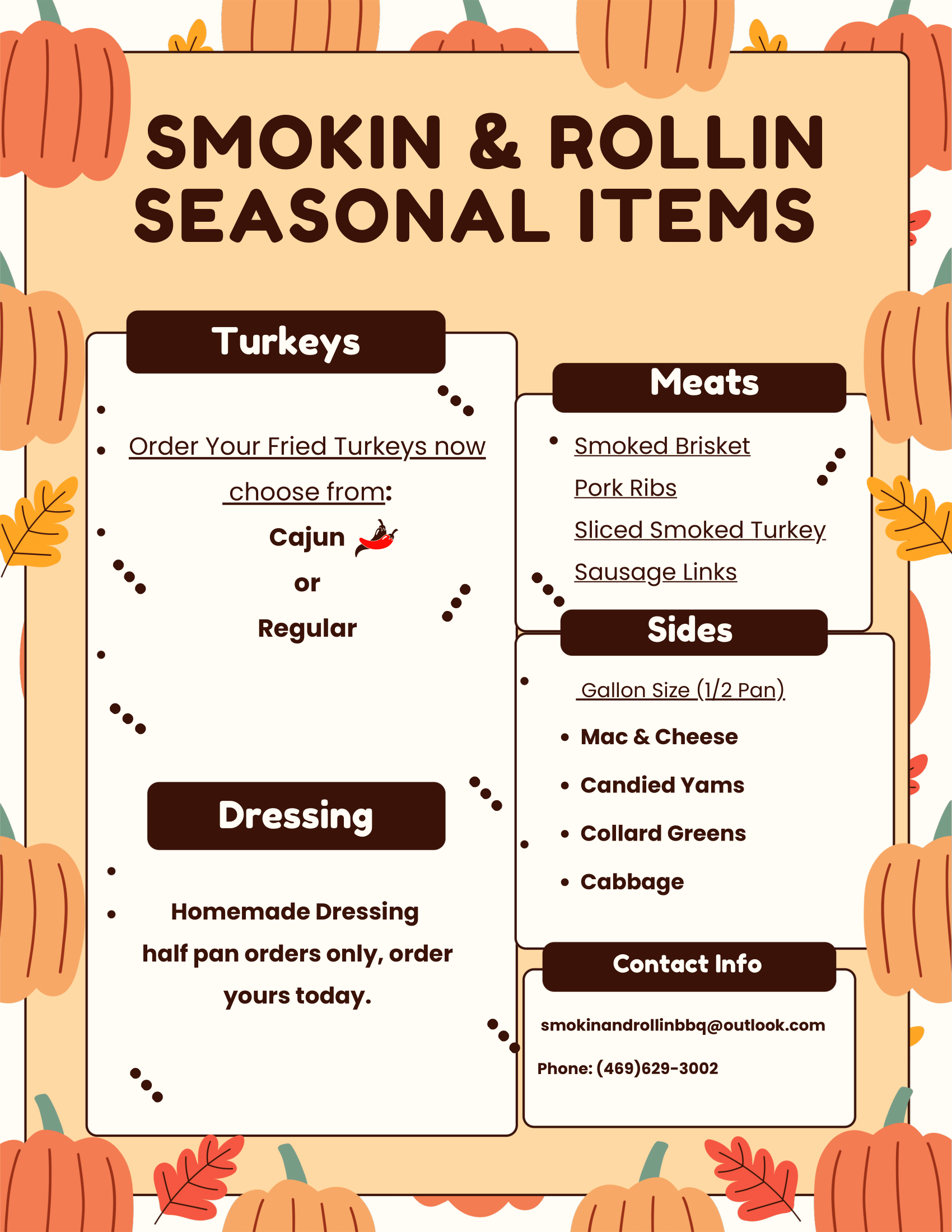 We believe our entire menu is as unique as we prepared them. Come back to taste much more delicious food for your soul. With plenty of choices and quality service from our staff, you won't find a better food truck around! We can also provide catering services for all your events. We would love for the opportunity to show you the love and hard work we put into our cooking, so come check us out at Smokin' & Rollin' BBQ today!